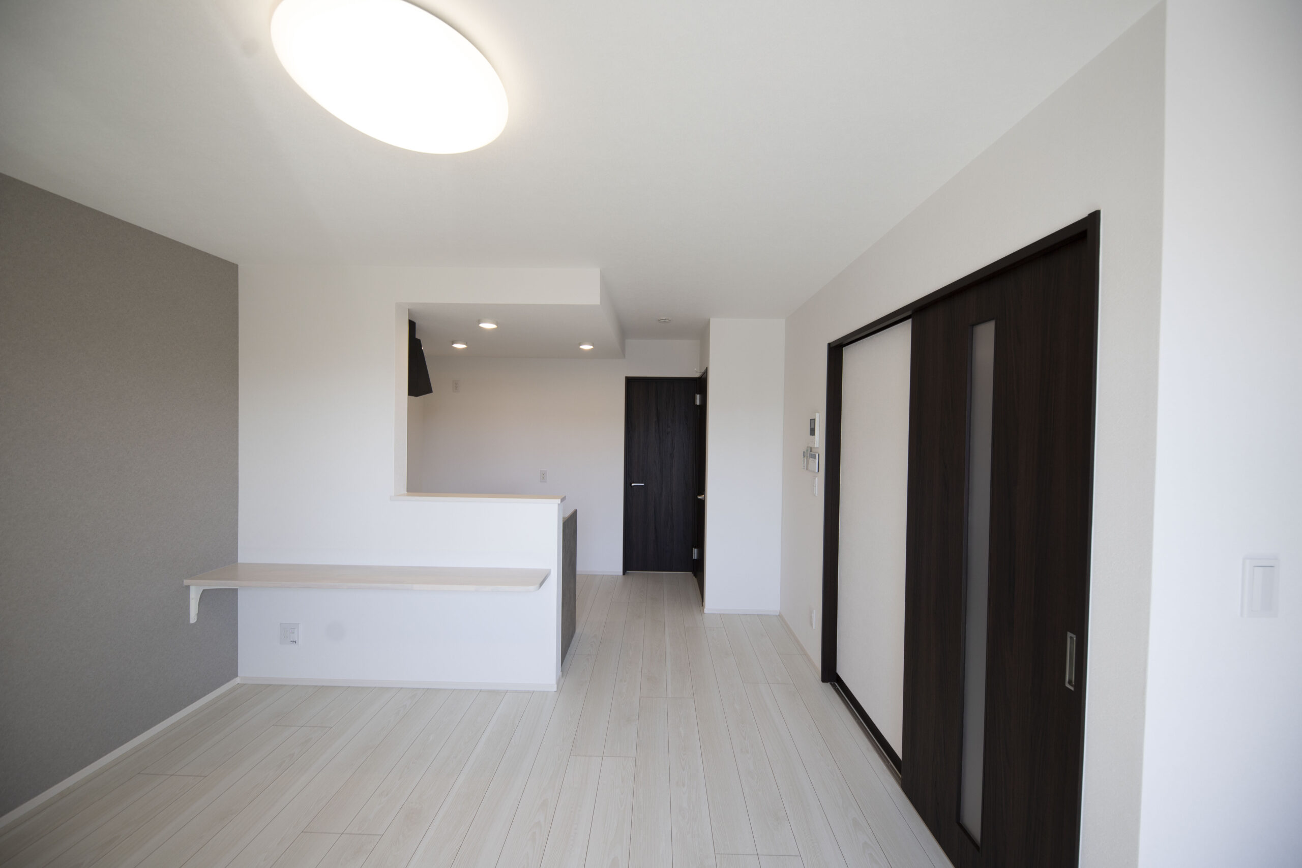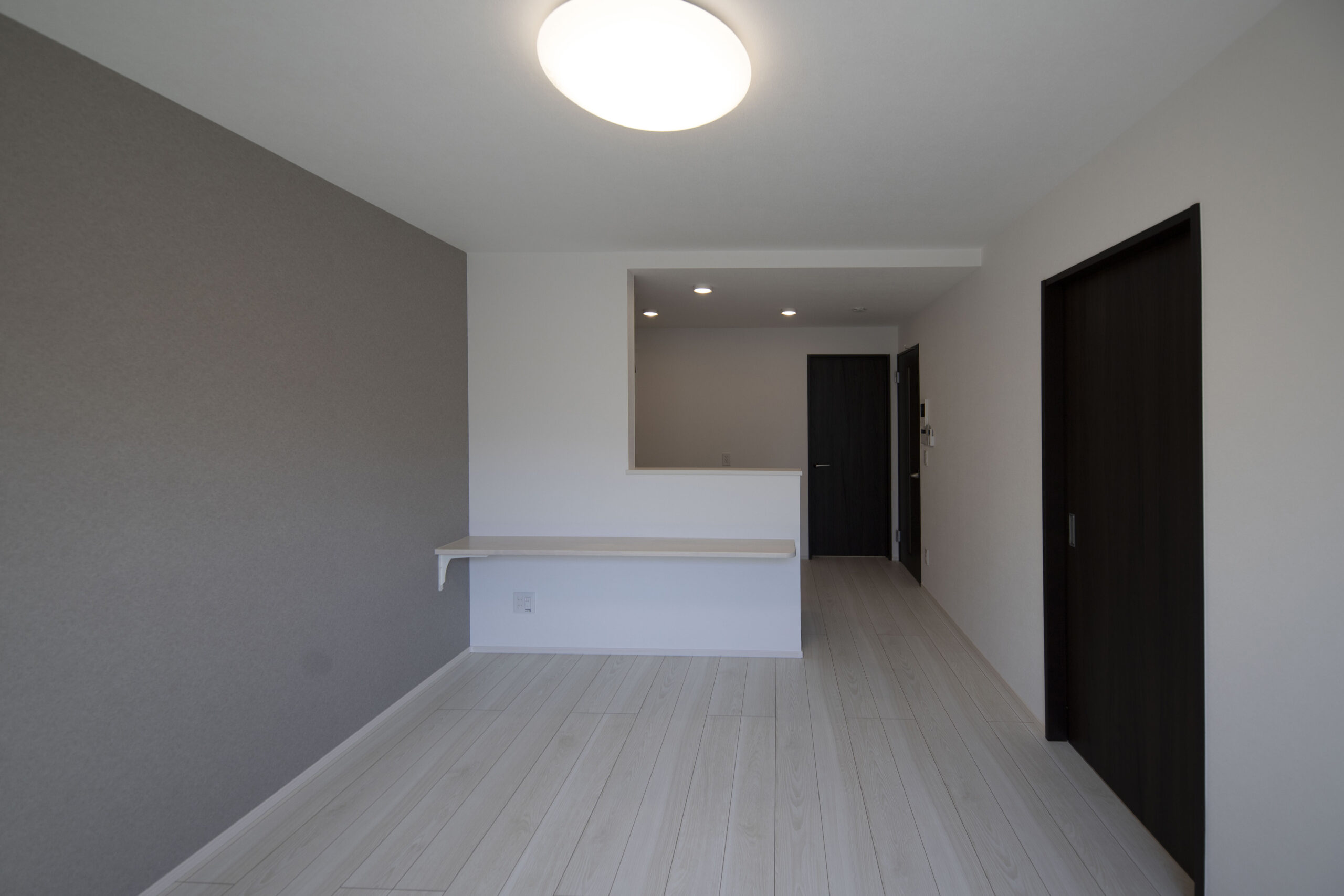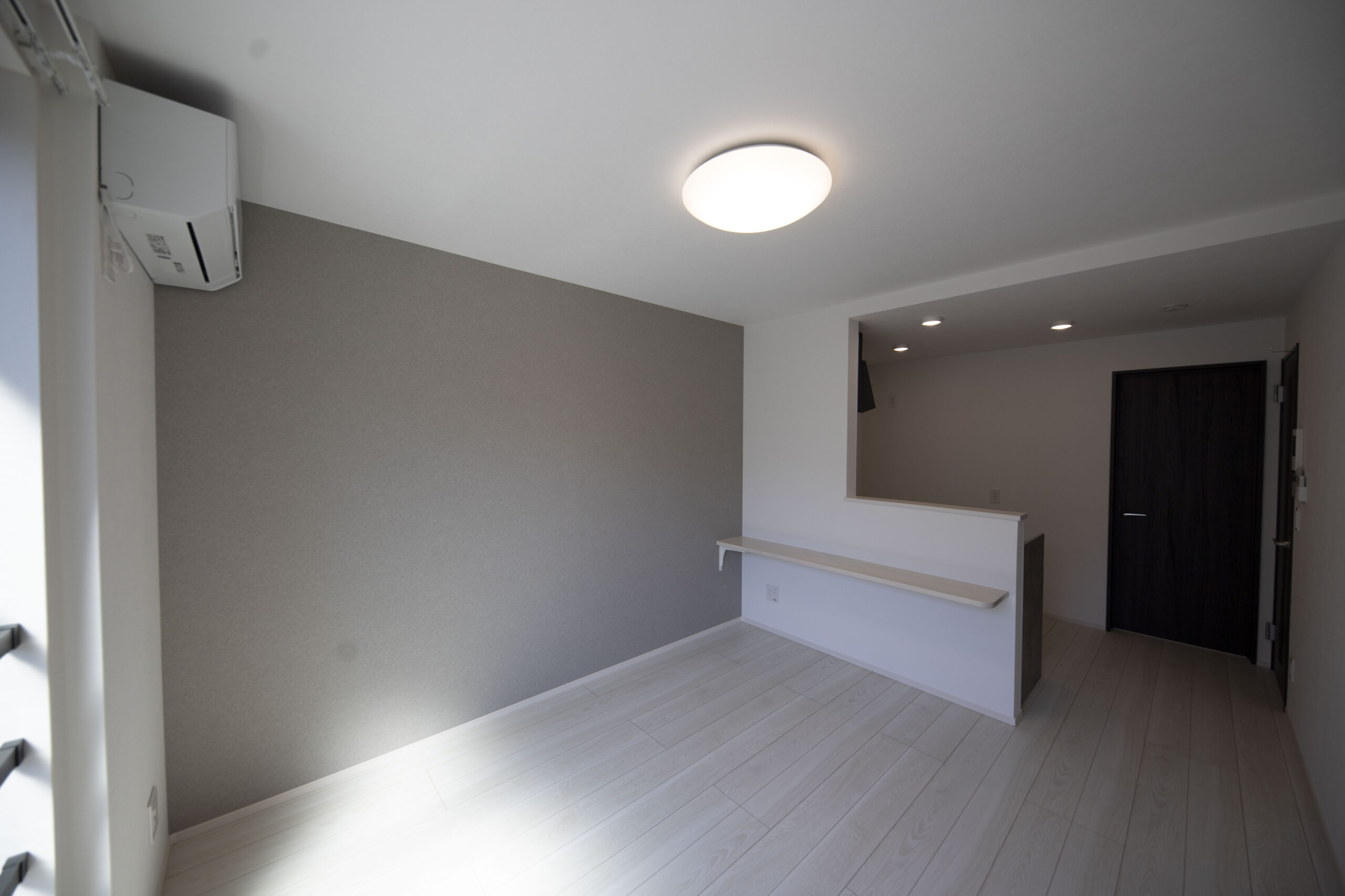 キッチン前には便利なカウンターを設置。お食事はもちろん、ちょっとした勉強や作業スペースとしてもお使いいただけるので、ダイニングテーブルを置かずにスッキリとした空間づくりが可能です。