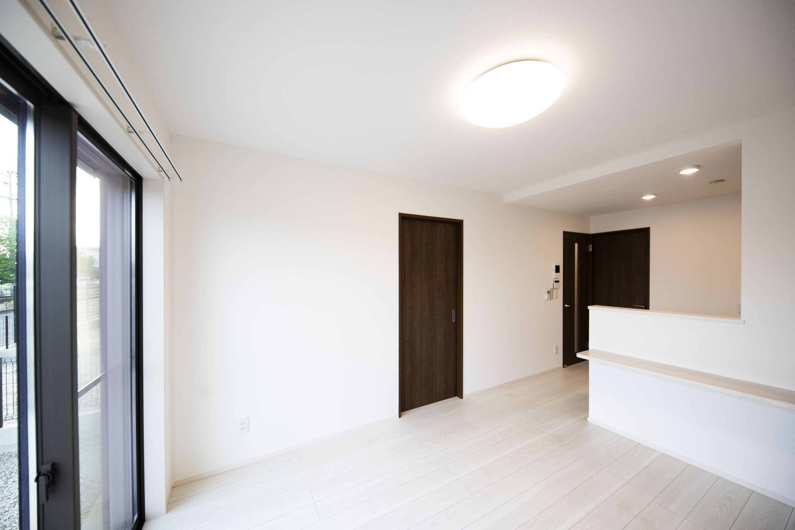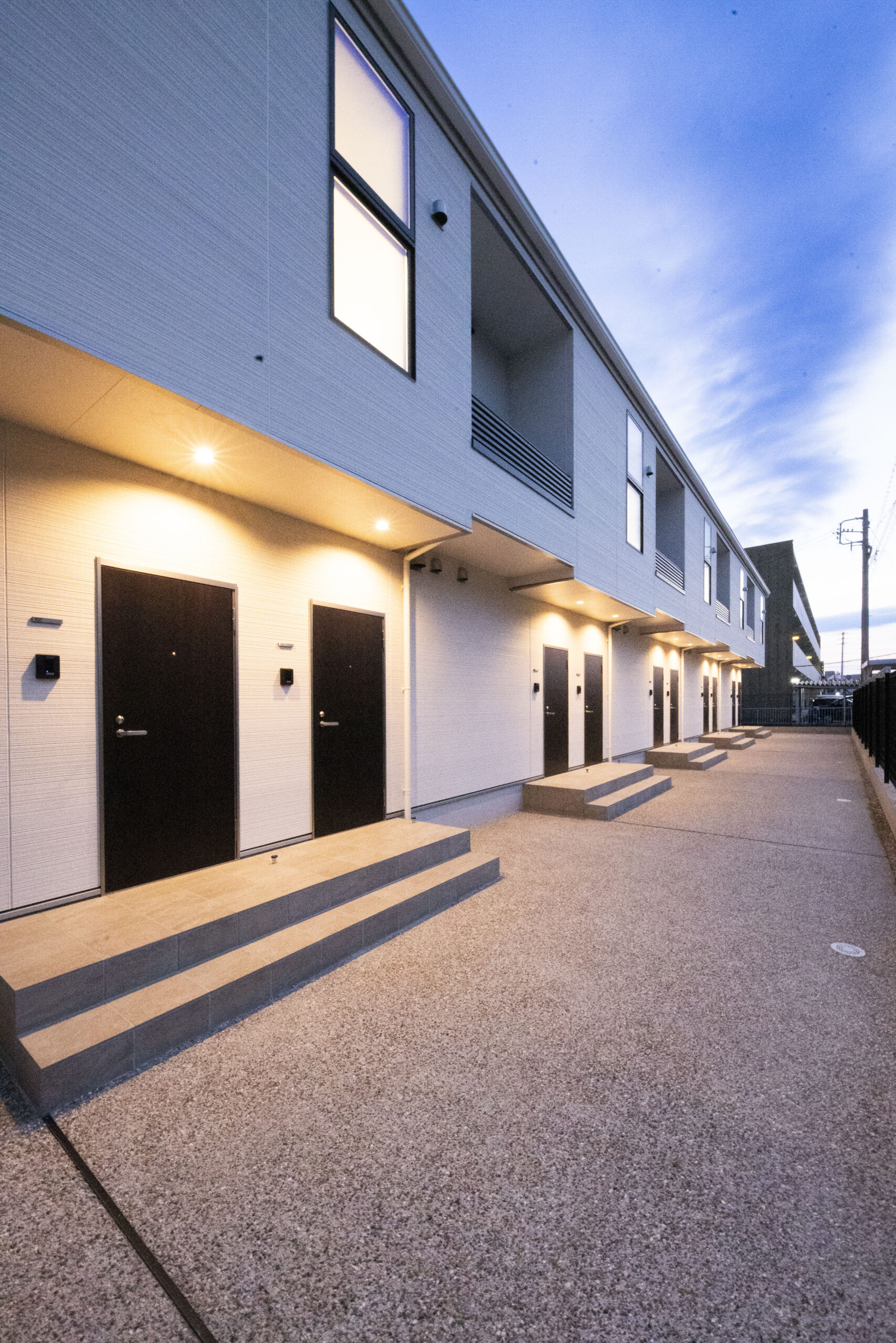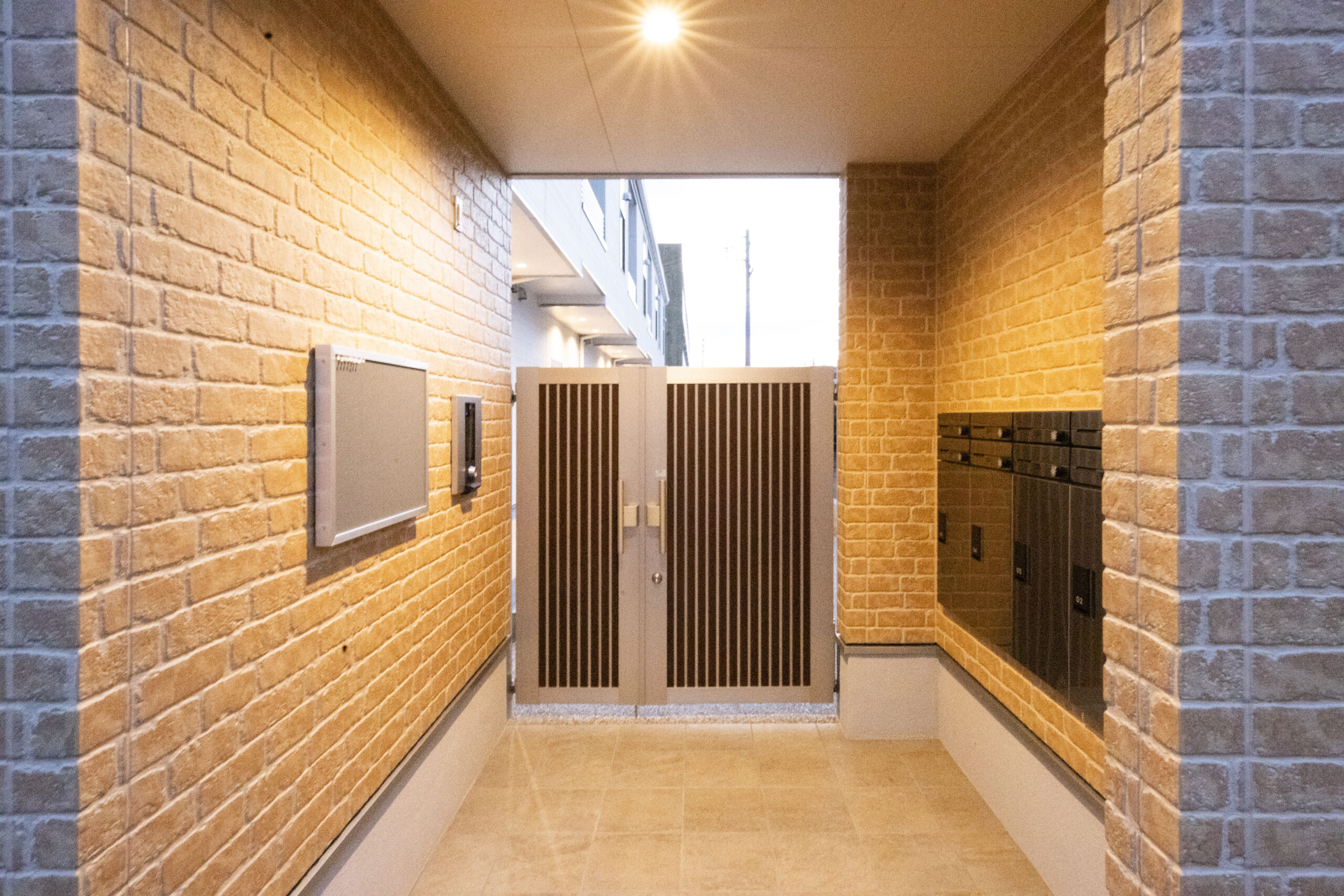 物件には、入居者の快適な暮らしを支える設備を数多く備えています。エントランスは独立棟とし、オートロックを導入することでセキュリティを強化。浴室には暖房乾燥機を標準設置し、寒い季節も快適に過ごせるほか、天候を気にせず洗濯物を乾かすことができます。共用部のごみ置場にはストッカーを設置し、猫やカラスによる被害を防止。各住戸にも暮らしやすさを高める工夫を施しました。キッチン前のカウンターは食事や勉強に便利で、ダイニングテーブルを置かずに生活できる設計。2階のLDKにはワークスペースを設け、書斎や家事コーナーとして活用できます。室内には床に水に強い素材を用いた物干コーナーを設け、日常の家事をサポート。さらに1階住戸には広々とした専用庭を設置し、リビングからの空間に広がりをもたせるとともに、ガーデニングやお子様の遊び場、アウトドア用品のお手入れなど多彩な使い方を楽しんでいただけます。