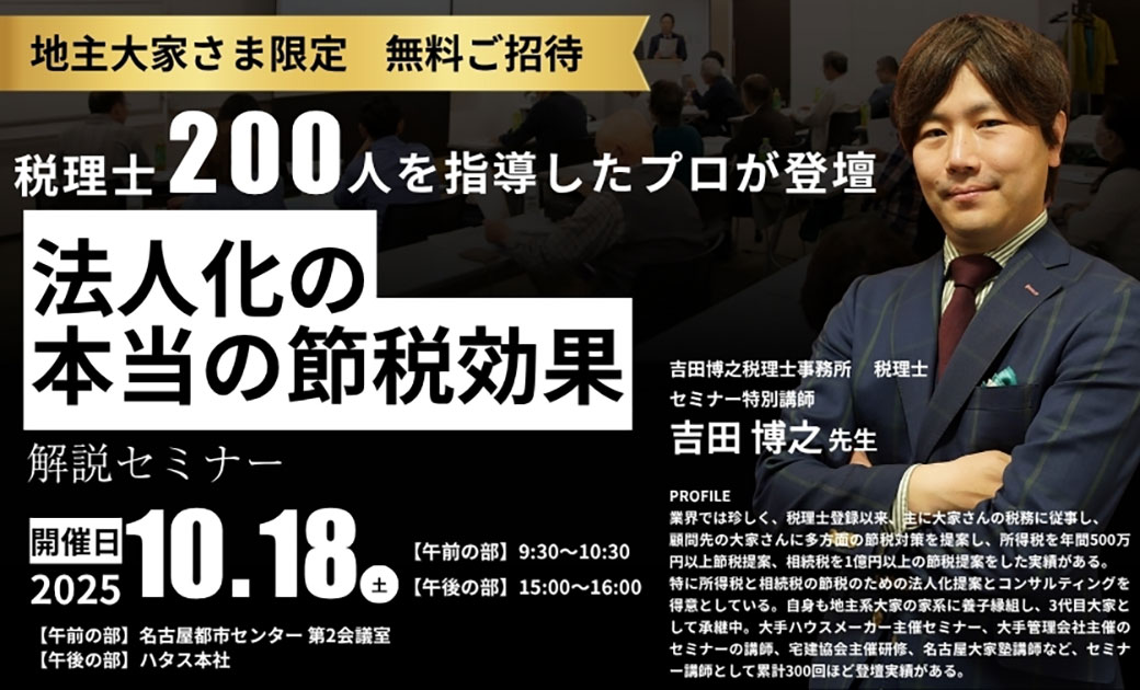 「法人化すれば節税になる」と聞いたことはありませんか?しかし、実際には個々の状況によって効果は大きく異なります。本セミナーでは、税理士200人を指導したプロフェッショナルが、「地主・大家」に特化した実例をもとに、本当に効果のある法人化による節税対策を解説します。