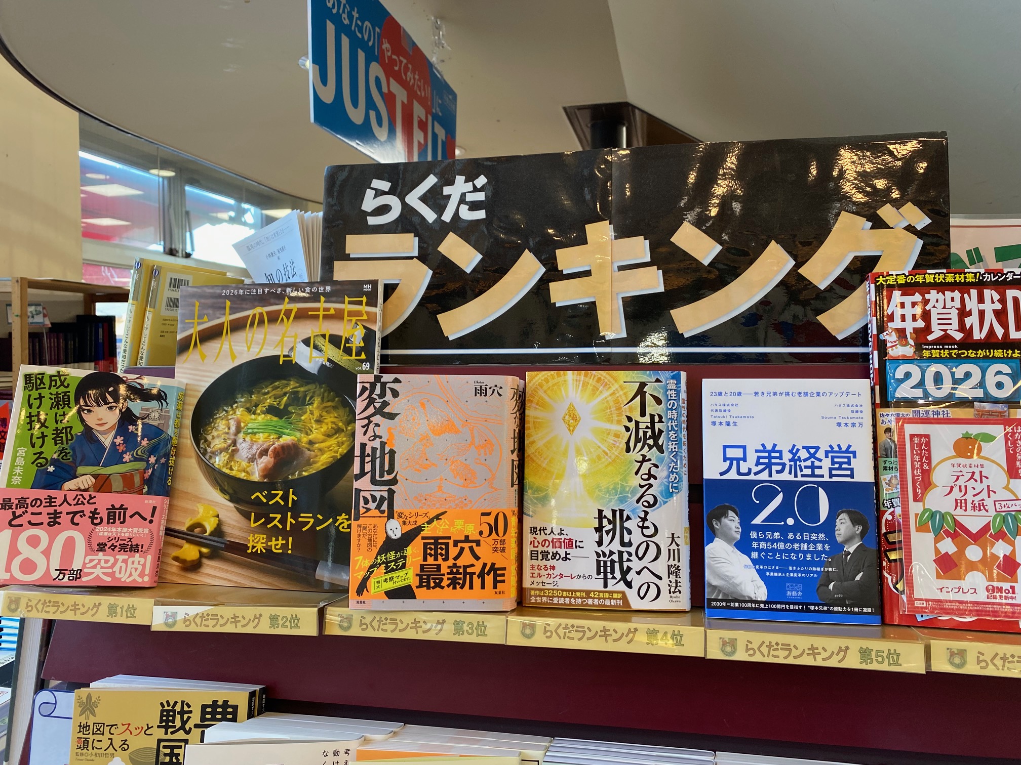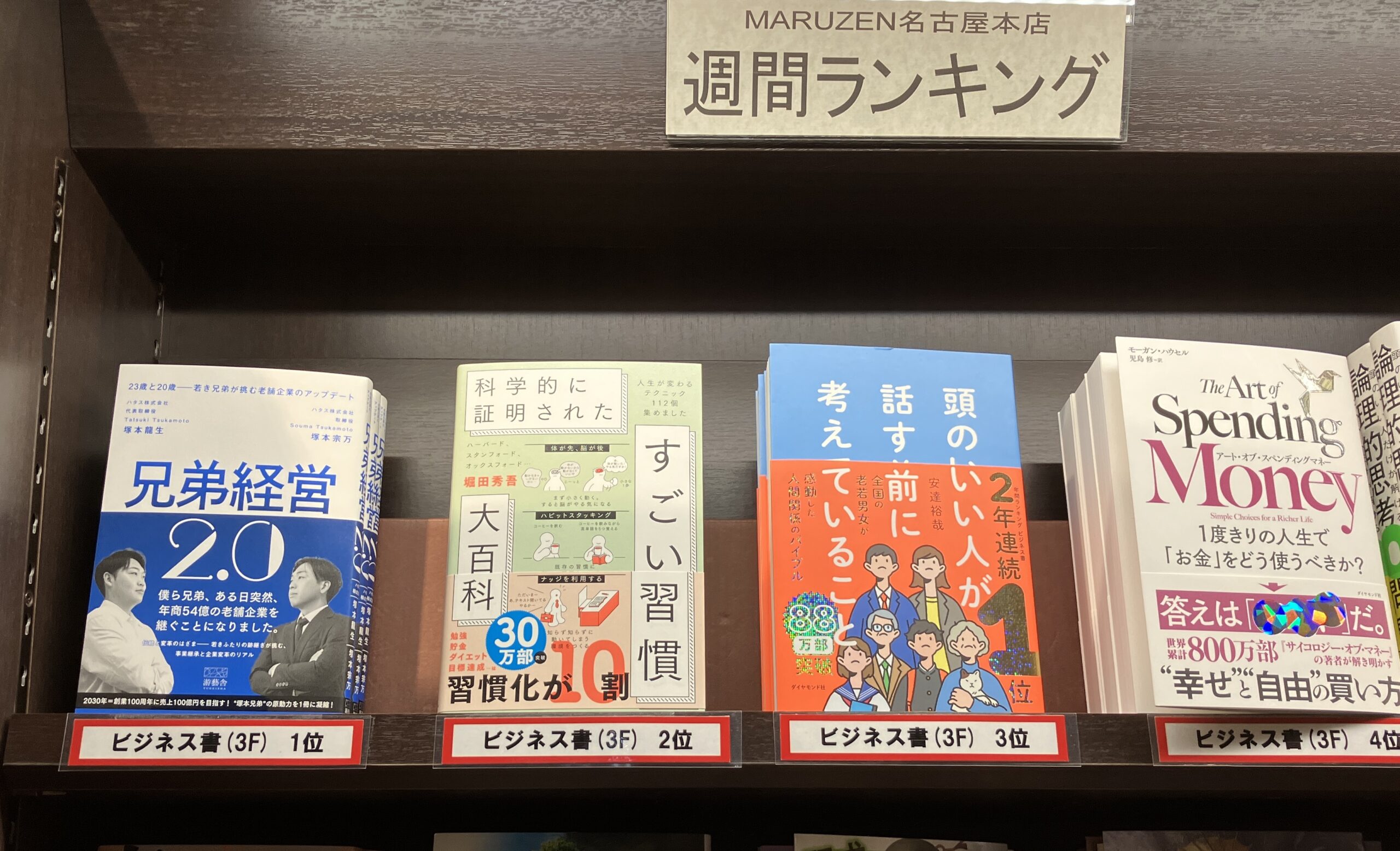 2025/12/24 お知らせ 【書店掲載のお知らせ】週間ランキングにて展開いただきました 丸善名古屋本店様より、『兄弟経営2.0』が週間ランキングにて取り上げられました。現在、同店ビジネス書コーナーにて展開いただいております。 また、らくだ書店様におきましても、ビジネス書部門にて上位作品として取り上げられ、「ビジネス書 新刊&話題書」コーナーにて展開いただいております。 お近くにお立ち寄りの際は、ぜひ各書店様にてお手に取ってご覧いただけますと幸いです。 丸善名古屋本店様 らくだ書店様 ※掲載・展開状況は店舗さまの都合により変更になる場合があります。(写真は店頭掲出の様子です)