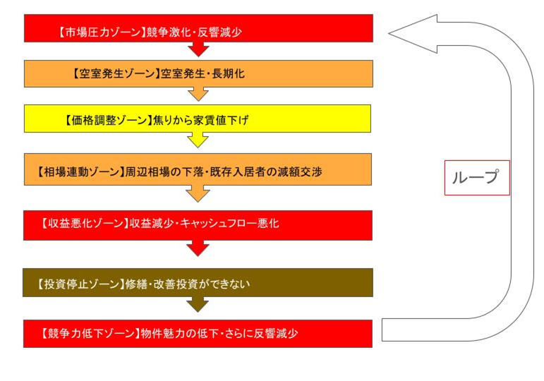 一時的に入居が決まったとしても、長期的に見ると収益体質が弱くなります。十分な修繕や改善ができなくなると、物件の印象や設備水準はさらに見劣りし、再び空室が発生します。この悪循環に入ると、「空室」と「家賃下落」が同時に進行し続ける状態になります。