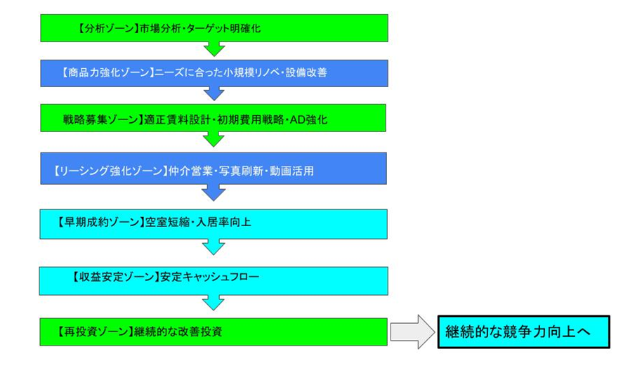 この図のポイントは、🟨「家賃値下げ」の段階が“分岐点”になっていることです。ここで安易に値下げを選択すると、長期的な収益体質が弱くなります。重要なのは、🟧空室が発生した段階で、価格ではなく「戦略」で手を打つことです。